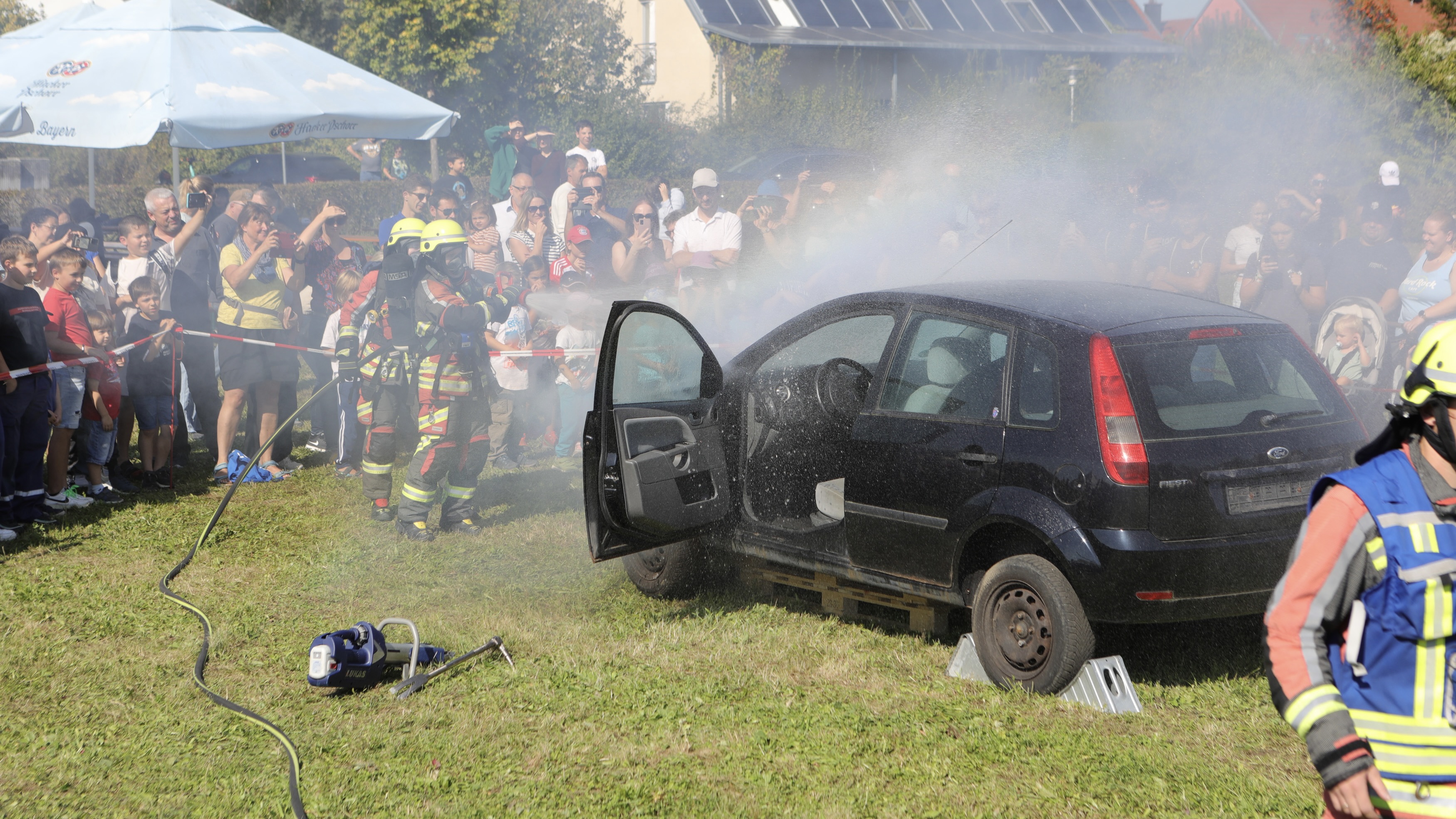 Gegen 14:00 Uhr begann schließlich das kurzweilige Duell im Saugschlauchkuppeln. Im Anschluss demonstrierte die aktive Mannschaft in einer Schauübung den interessierten Zuschauern, wie eine Person aus einem brennenden PKW gerettet, versorgt und der Brand schließlich gelöscht wird.